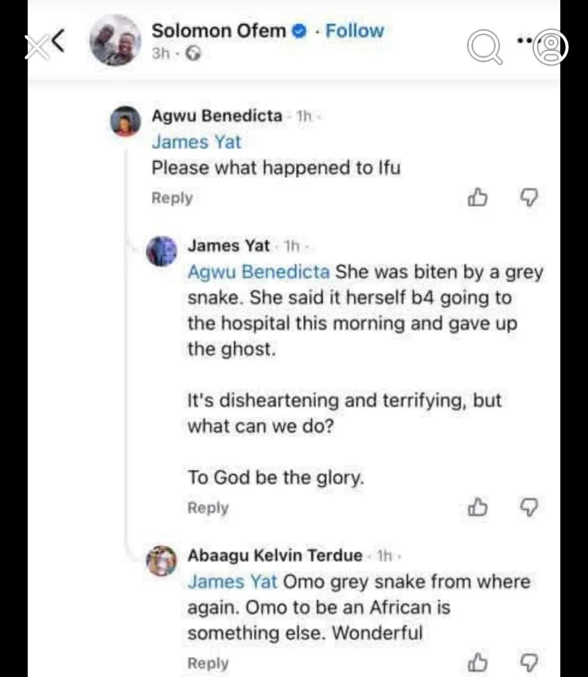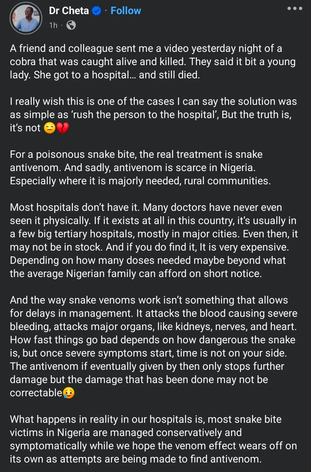 “A friend and colleague sent me a video yesterday night of a cobra that was caught alive and killed. They said it bit a young lady. She got to a hospital… and still died.