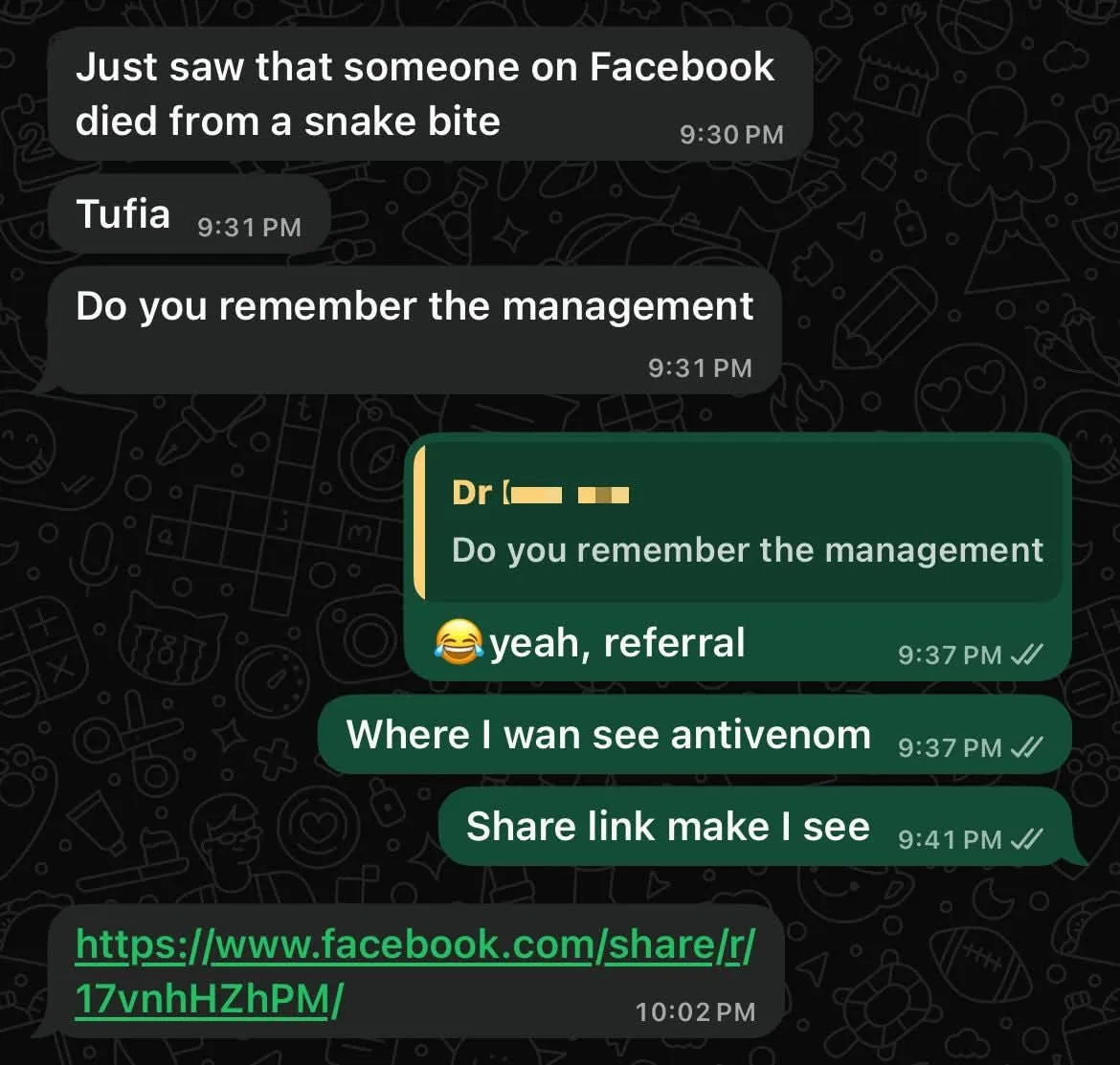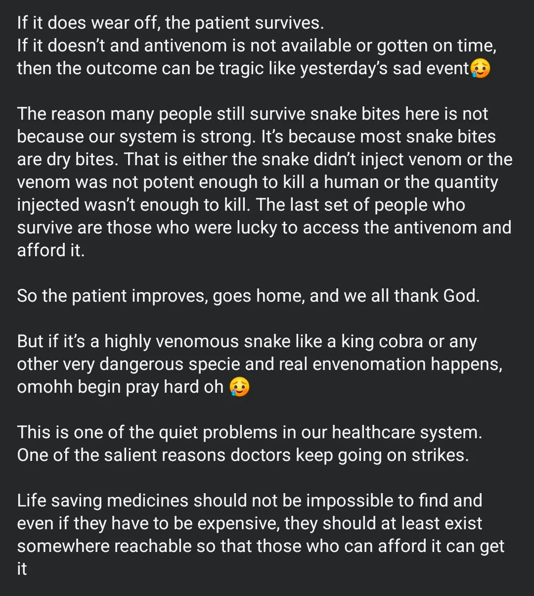But if it’s a highly venomous snake like a king cobra or any other very dangerous specie and real envenomation happens, omohh begin pray hard oh 🥲