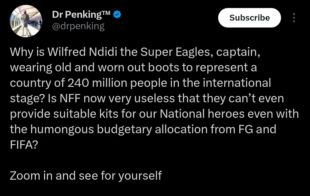 The user expressed concern that Ndidi appeared to be wearing old and visibly worn-out boots while representing Nigeria on the global stage, describing the situation as a poor reflection of the country’s football administration.