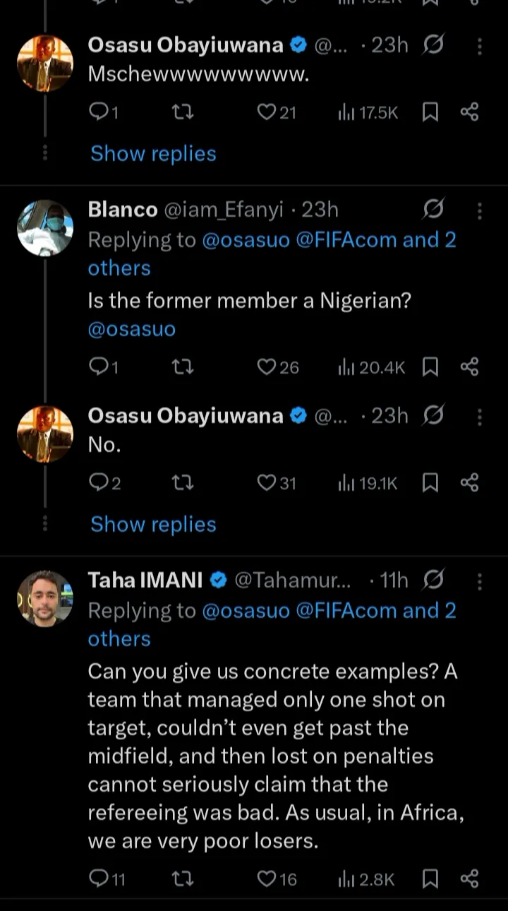 A Nigerian lawyer who has been identified as Osasuo, has taken to his X page to share a a strange view from a friend, who was formerly a member of the FIFA council.