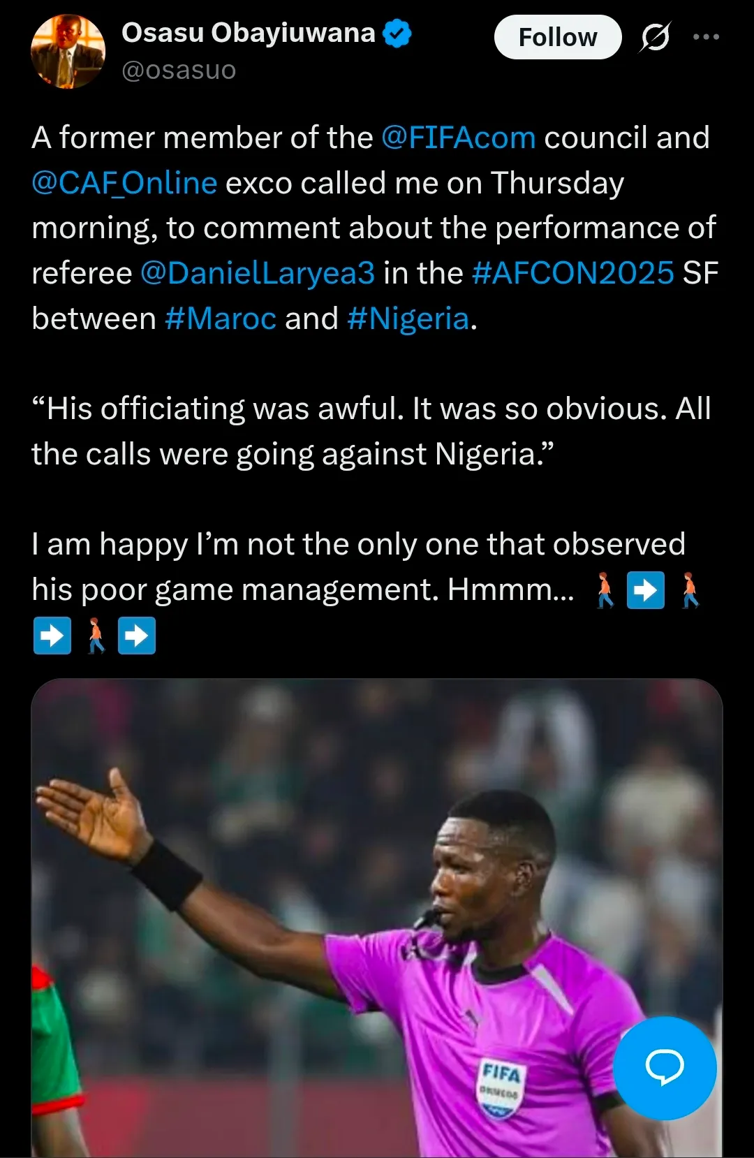 This was about the referee, Daniel Laryea, who officiated the match between Nigeria and Morocco during the African cup of nation semi-finals.