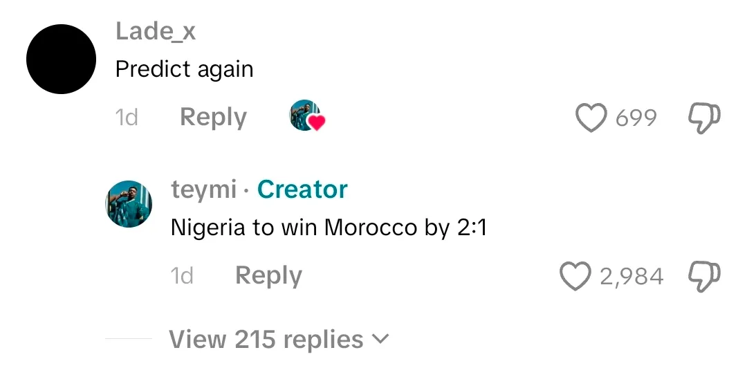 On his TikTok page, @teymi_dakiutest, he shared a post where he rightly predicted that Nigeria would beat Algeria by two goals, amid other predictions from various people about the match.