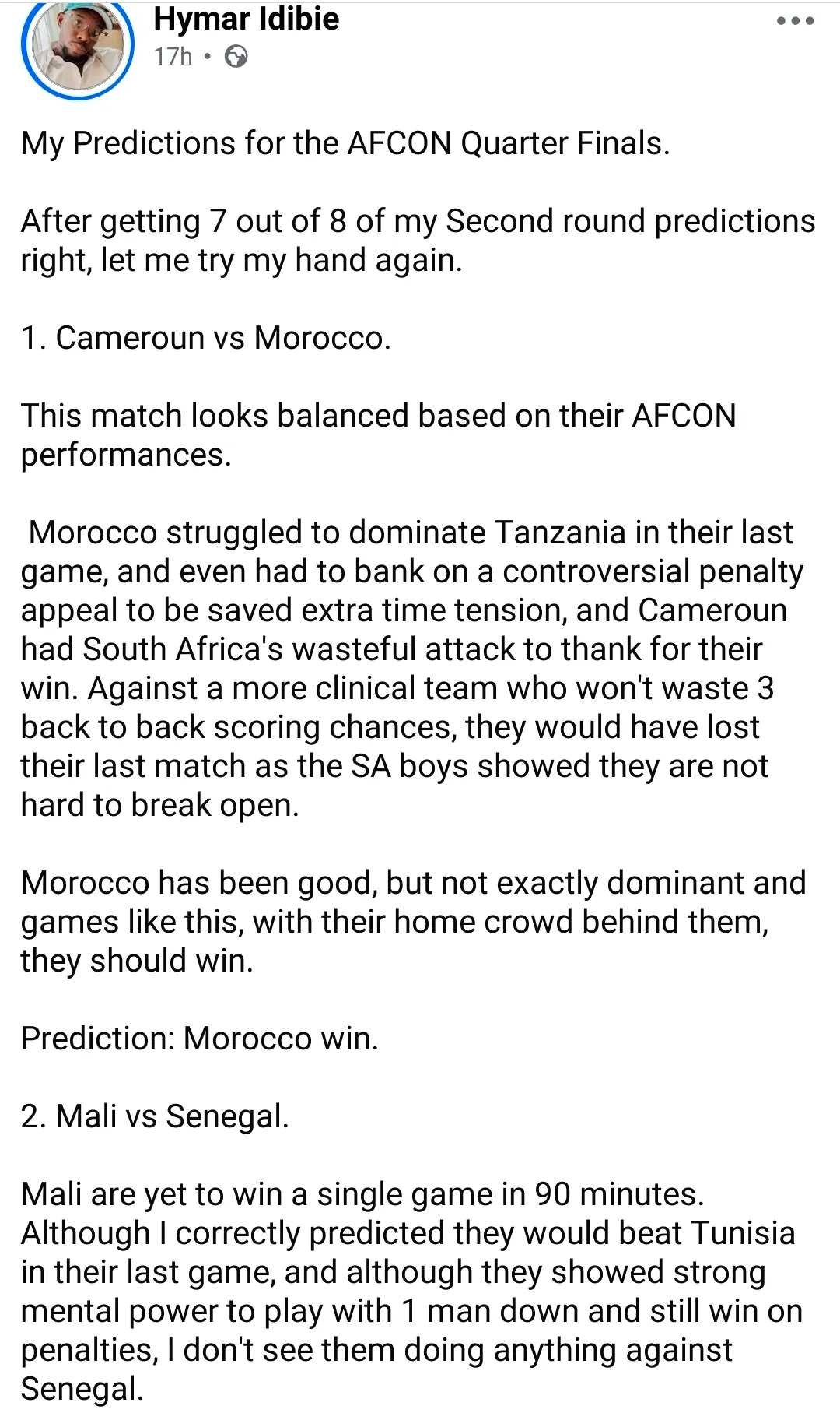 Hymar Idibie, a Nigerian man, has publicly shared his prediction of the Super Eagles of Nigeria’s AFCON quarter-final match with the Desert Foxes of Algeria on Saturday, January 10 at the Marrakesh Stadium in Marrakesh, Morocco.