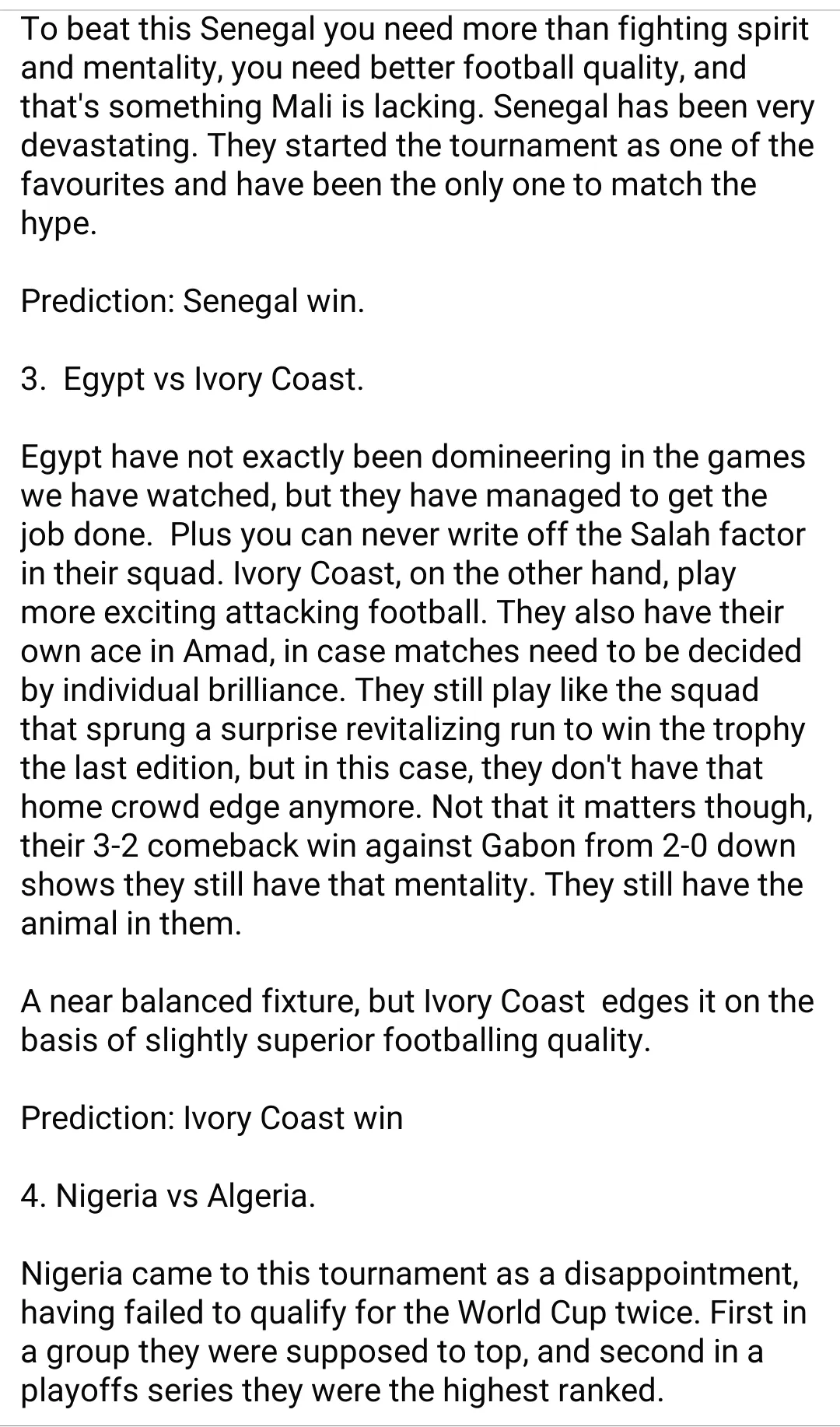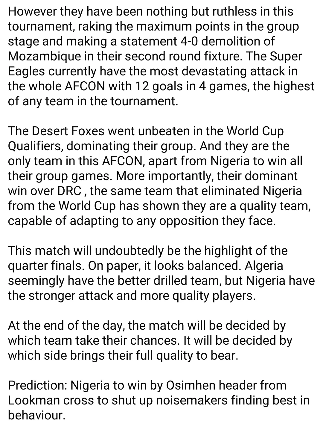“The Desert Foxes went unbeaten in the World Cup Qualifiers, dominating their group. And they are the only team in this AFCON, apart from Nigeria to win all their group games. More importantly, their dominant win over DRC , the same team that eliminated Nigeria from the World Cup has shown they are a quality team, capable of adapting to any opposition they face.
