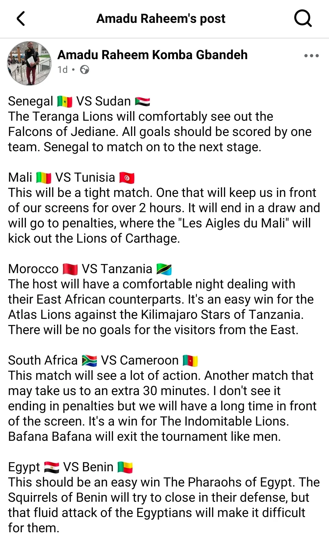 Amadu had also predicted the outcomes of the other Round of 16 fixtures and already got two correctly, following Senegal’s victory against Sudan and Mali’s win over Tunisia.