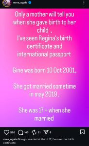 The light-skinned actress stated that she has seen the actress’s birth certificate and international passport, and according to them, she was born in 2001 and got married in May 2019. Doris insisted that Regina was 17 when she married Ned.