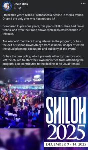 “Are Winners’ members losing interest in the program, or has the exit of Bishop David Abioye from Winners’ Chapel affected the usual planning, execution, and publicity of the event?