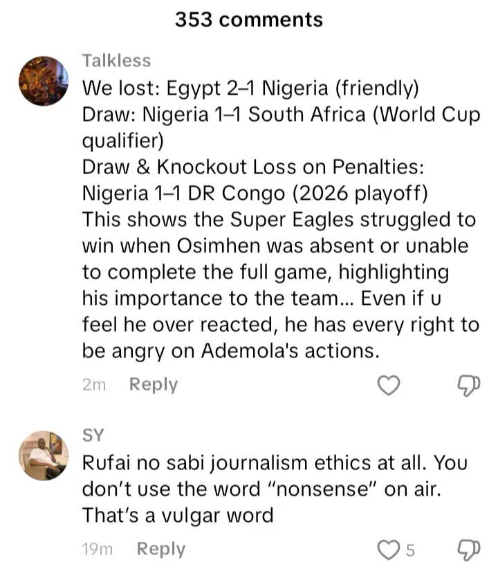 @rashidi_yakini Rufai condemns Osimhen for shouting at Ademola Lookman and threatening to pull out of the National Team! #supereagles🇳🇬