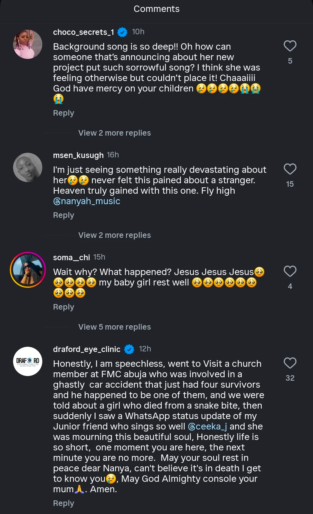 Netizens have reacted massively to the last post spotted on late singer Ifunanya alias Nanyah’s page days before her demise over snake bite.
