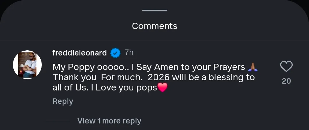 He also dropped a comment under the actress’ post saying; “My Poppy ooooo.. I Say Amen to your Prayers Thank you For much. 2026 will be a blessing to all of Us. I Love you pops.”