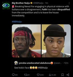 Faith was disqualified from the Big Brother Naija house by Biggie over his violent display towards his colleague, Sultana whom he got into a fierce altercation with a few moments ago.