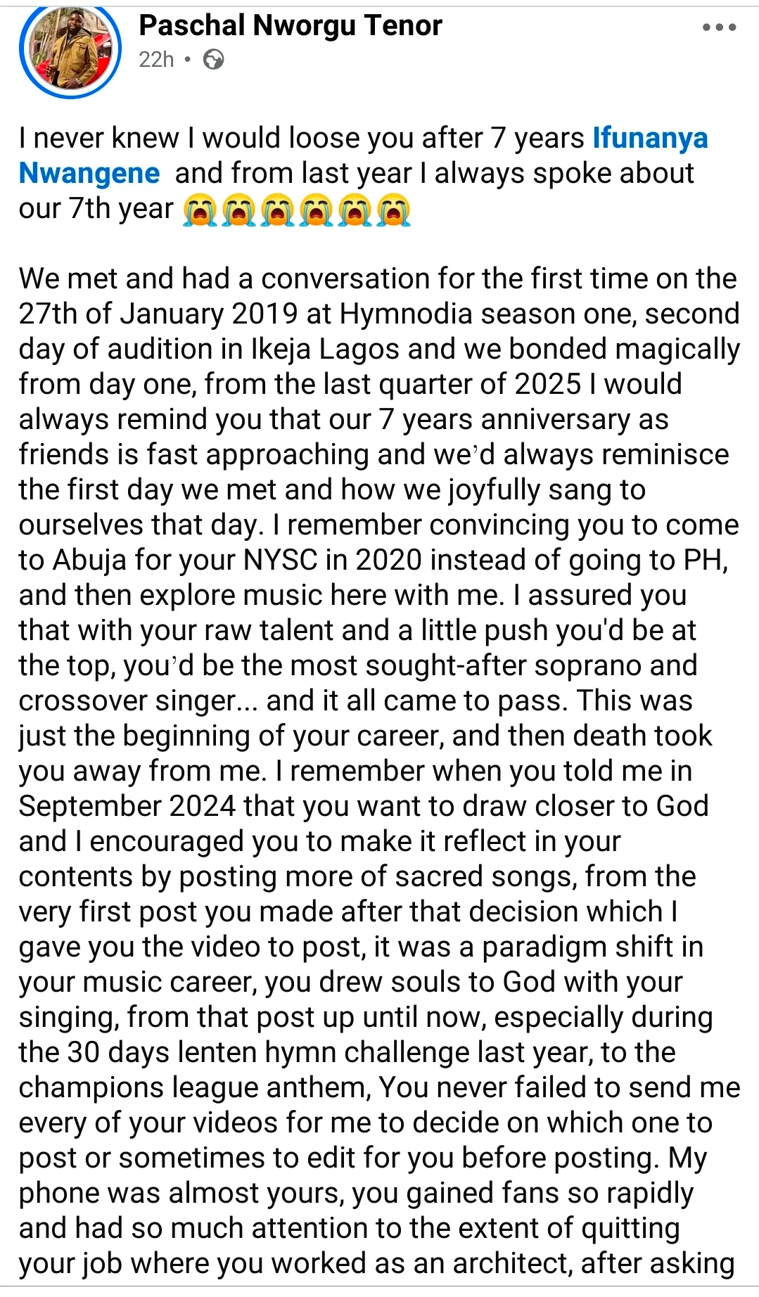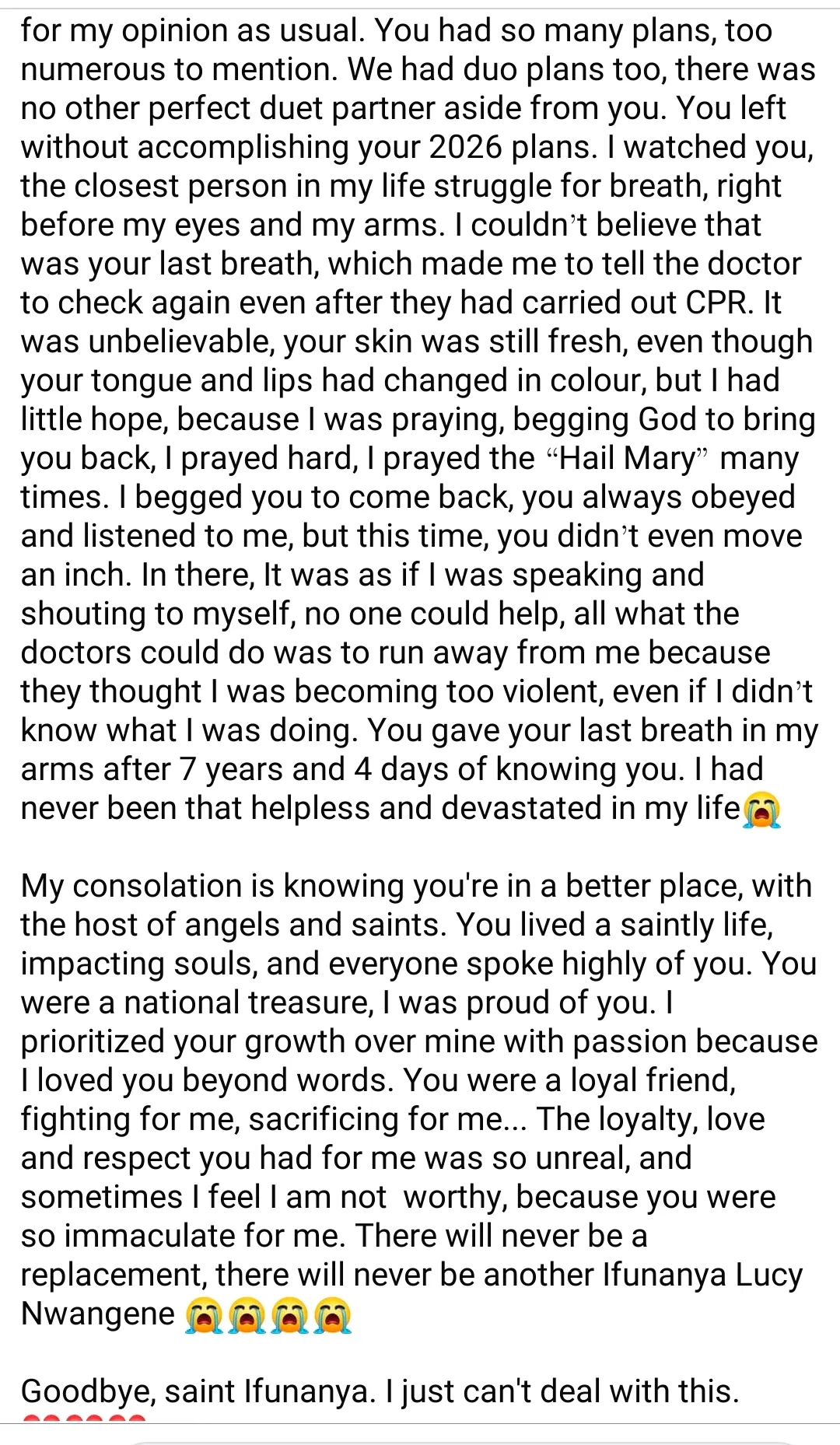 This was just the beginning of your career, and then death took you away from me. I remember when you told me in September 2024 that you want to draw closer to God and I encouraged you to make it reflect in your contents by posting more of sacred songs, from the very first post you made after that decision which I gave you the video to post, it was a paradigm shift in your music career, you drew souls to God with your singing, from that post up until now, especially during the 30 days lenten hymn challenge last year, to the champions league anthem, You never failed to send me every of your videos for me to decide on which one to post or sometimes to edit for you before posting. My phone was almost yours, you gained fans so rapidly and had so much attention to the extent of quitting your job where you worked as an architect, after asking for my opinion as usual.