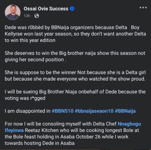 According to Ossai Ovie Success, the organizers of the reality show rigged the outcome against Dede who hails from Delta state because Kellyrae from Delta State won last season.
