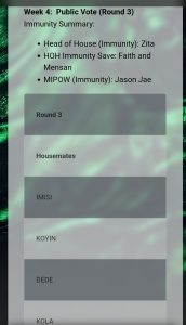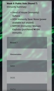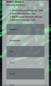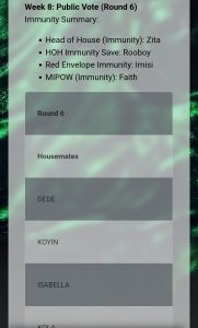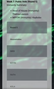 The closest Faith came to topping the list was in week 9 when he finished 3rd behind Dede (2nd) and Imisi (1st).