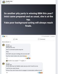 A Facebook user, Amaka Lucy recently expressed their thoughts on BBNaija housemate Imisi, claiming that her success on the show is due to her “pity party” strategy.