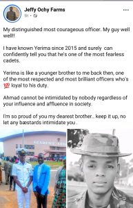 In a Facebook post, Jeffy hailed Yerima as a courageous officer. The farmer, who has known Yerima for a decade, described him as one of the most fearless cadets he knows.