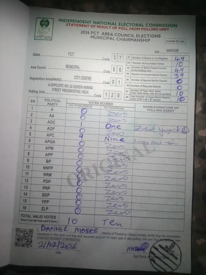 Results sighted from the Independent National Electoral Commission Result Viewing Portal indicated that voting took place in parts of the Villa under the Municipal Area Council.