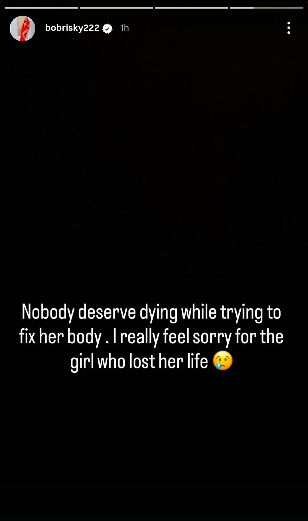 In the post, Bobrisky lamented the situation and said no one deserves to lose their life while attempting to make changes to their physical appearance.