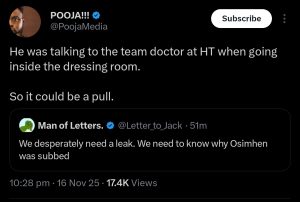 A X user while demanding to know why Osimhen was abruptly subbed off averred that Nigerians needed a leak urgently, adding that citizens needed to know why he was removed.