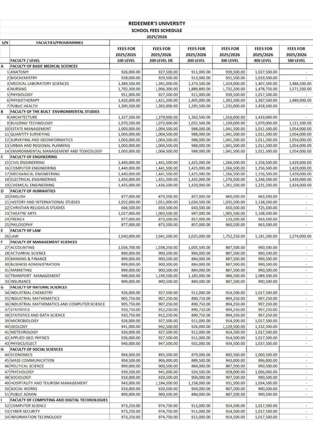 Redeemer’s University has made public its approved tuition fees for the 2025/2026 academic session for both new and returning students.