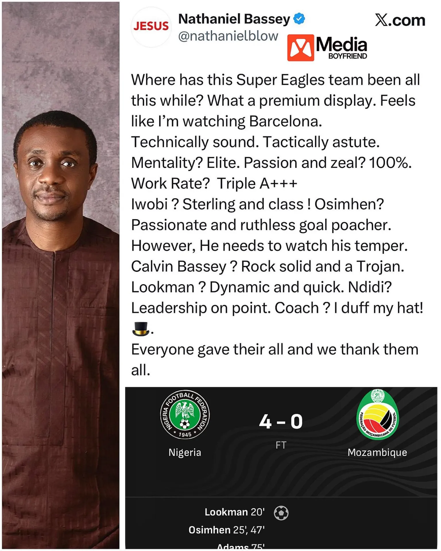 Nathaniel Bassey who apparently watched the match took to his X handle to commend the performance of the boys.