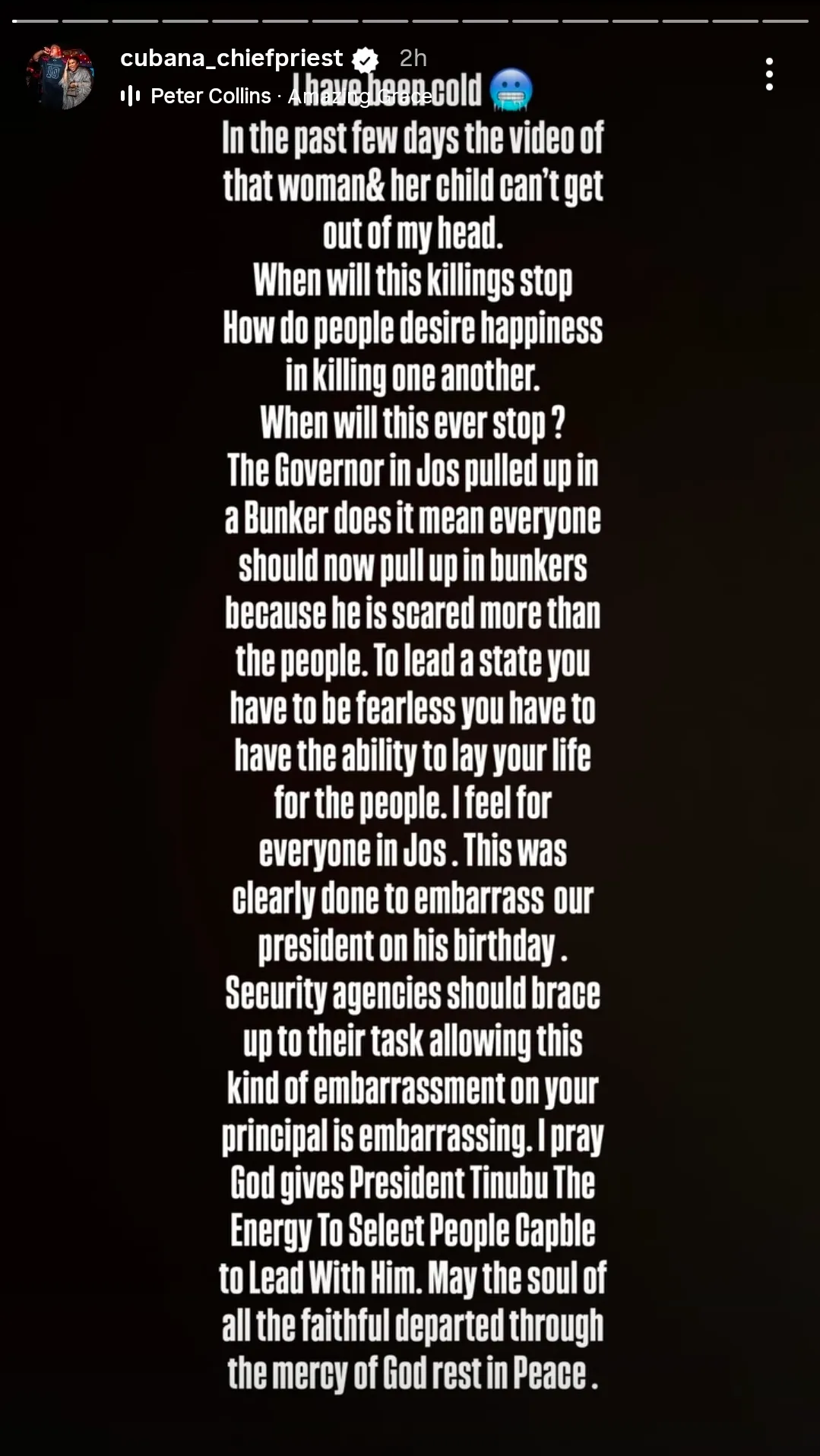 Celebrity barman and socialite Cubana Chiefpriest has reacted to the recent killings that occurred in Jos on Sunday, March 29th, expressing grief and frustration over the tragic incident.