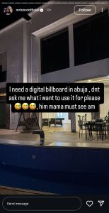 The businessman told his fans not to ask him what he would use the billboard for in Abuja. However, he hinted at his plan, saying, “His mama must see am,” accompanied by a smiling emoji.