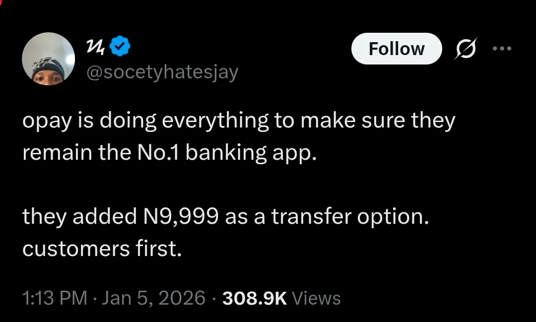 “Opay is doing everything to make sure they remain the No.1 banking app. They added N9,999 as a transfer option. Customers first,” the man said.