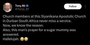 He alleged that the name of the church is Siyanikana Apostolic Church in Durban, South Africa.