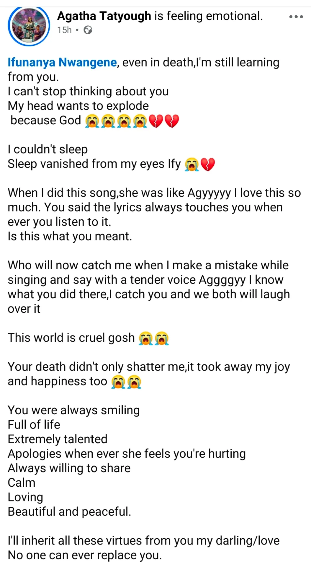 “Ifunanya Nwangene, even in death,I’m still learning from you. I can’t stop thinking about you. My head wants to explode because God. I couldn’t sleep. Sleep vanished from my eyes Ify “When I did this song,she was like Agyyyyy I love this so much. You said the lyrics always touches you when ever you listen to it. Is this what you meant?