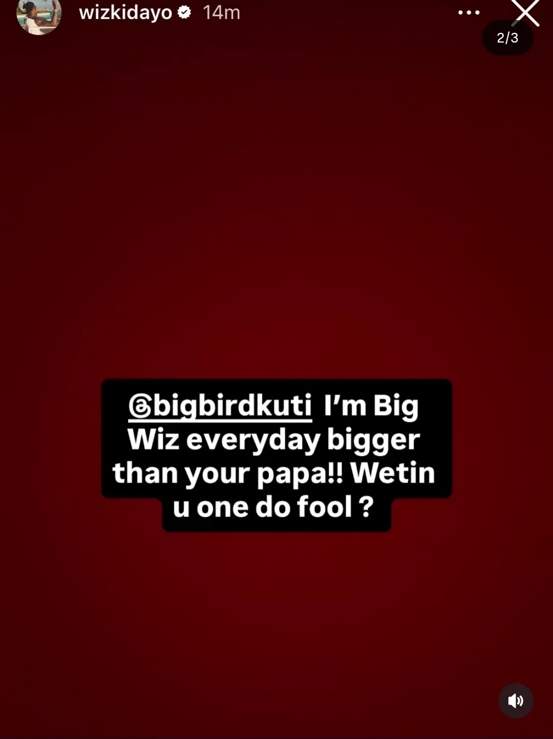 Wizkid wrote, “Pussyboy@bigbirdkuti, ok i big pass your papa, wetin u won do, ? fool at 40.”