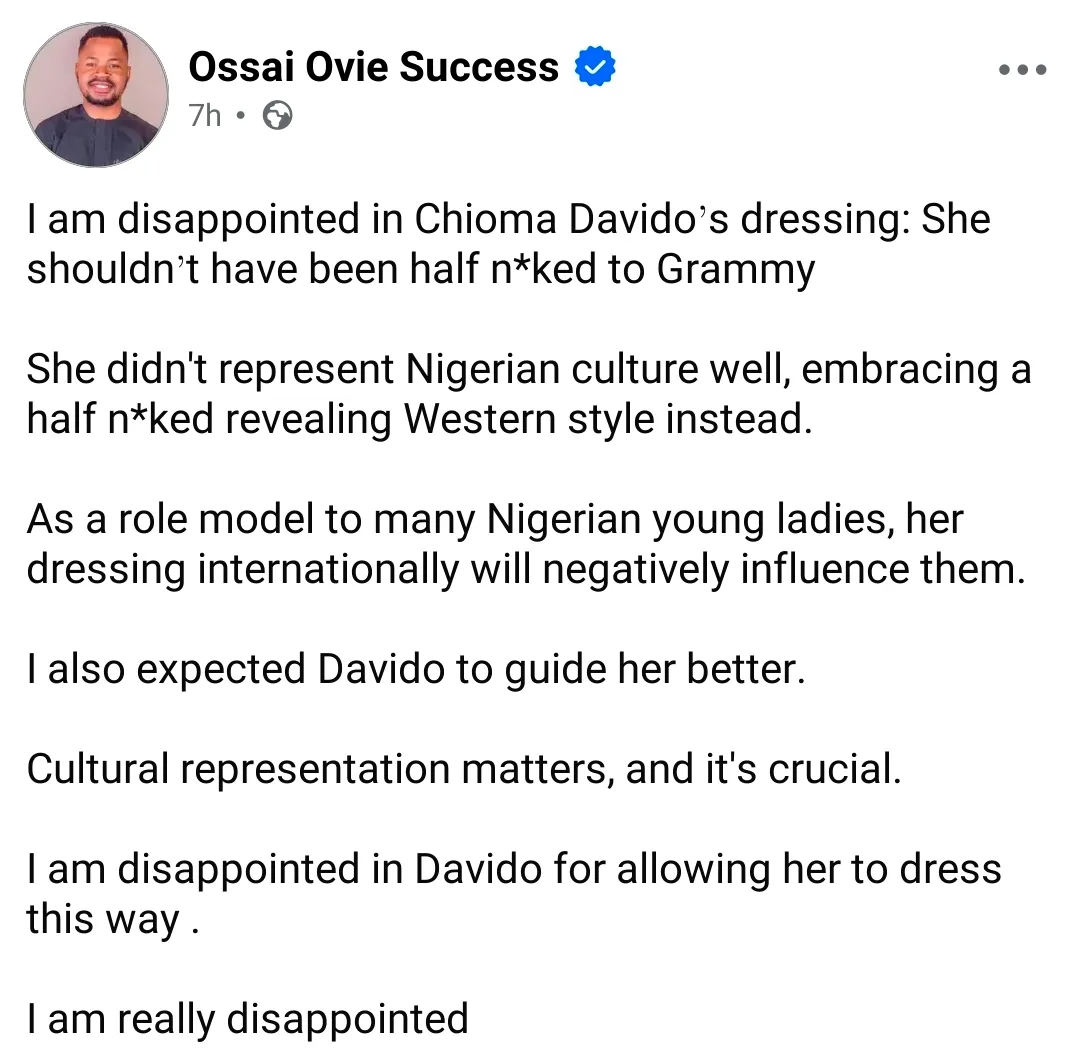Ossai Ovie Success, the Senior Special Assistant on Media to Delta State Governor, Sheriff Oborevwori, has criticised Davido and Chioma over the outfit she wore to the 2026 Grammy Awards.