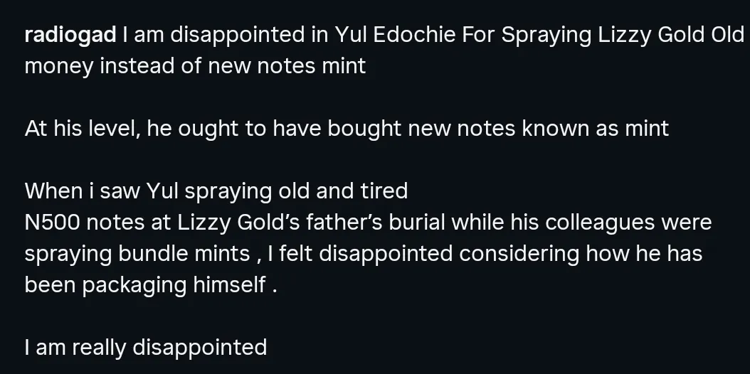 In the post, Radiogad was more concerned about the quality of the money being sprayed. He pointed out that at Yul Edochie’s level and status in the entertainment industry, he should have made a stronger impression by spraying newly minted notes, especially considering that other colleagues at the event were seen spraying fresh bundles.