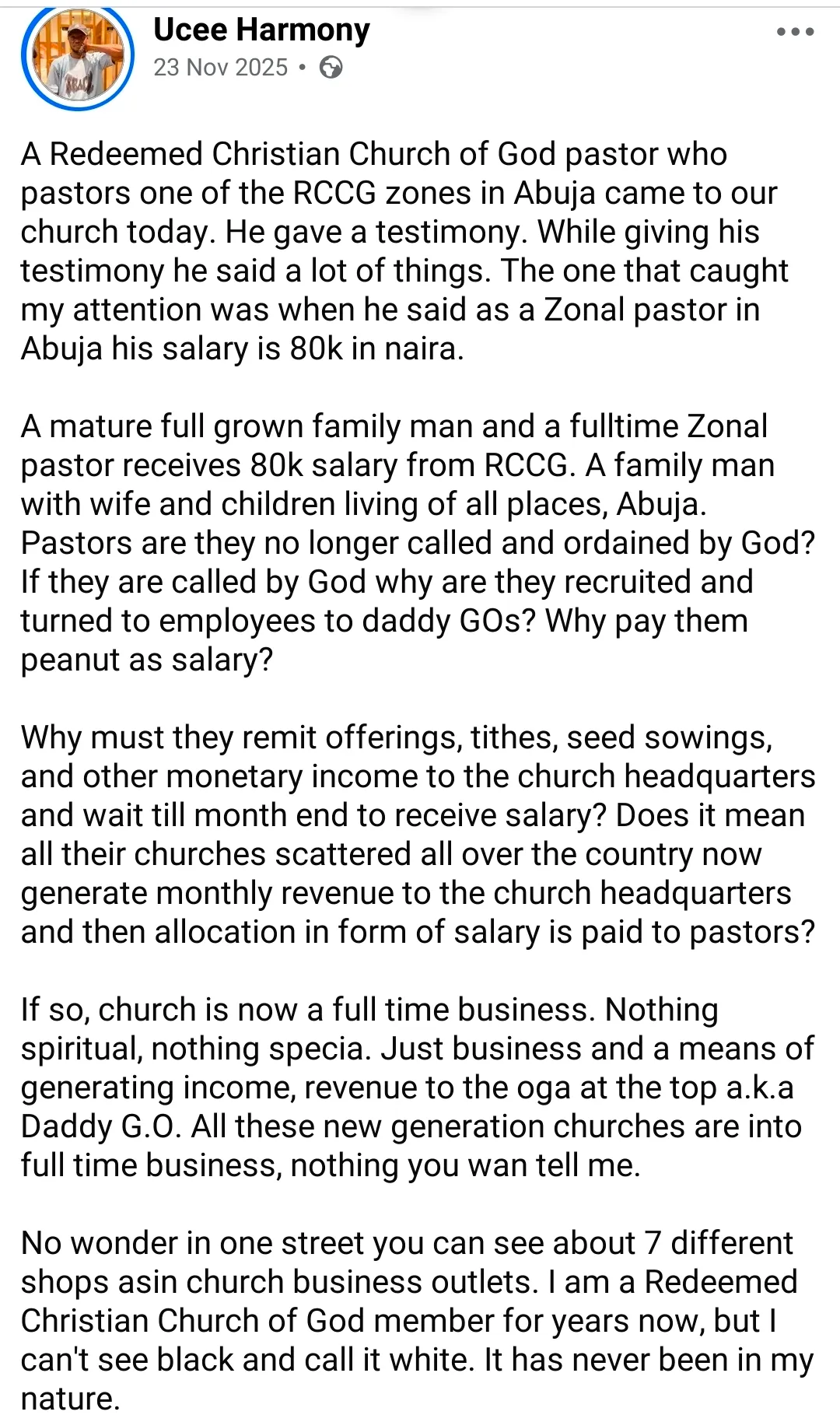 “A Redeemed Christian Church of God pastor who pastors one of the RCCG zones in Abuja came to our church today. He gave a testimony. While giving his testimony he said a lot of things. The one that caught my attention was when he said as a Zonal pastor in Abuja his salary is 80k in naira.