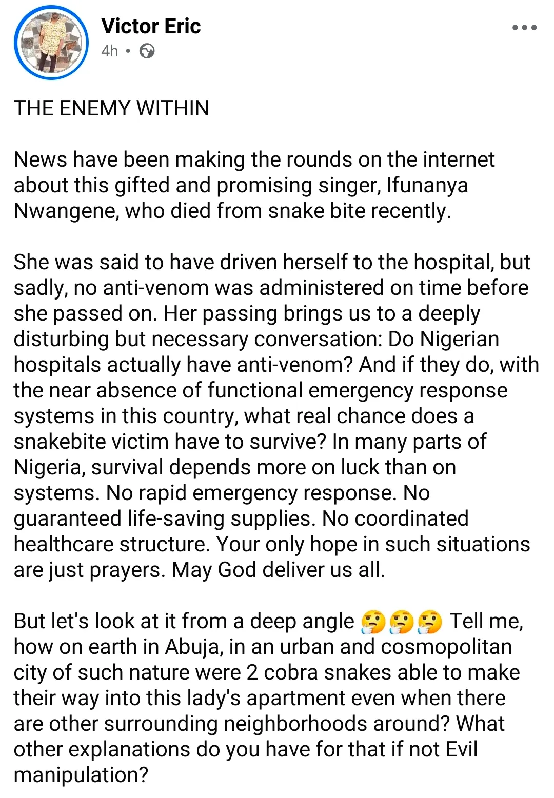 A Facebook user identified as Victor Eric, has taken to his handle to share some things he felt were strange about the cobra incident, which claimed the life of Ifunaya Nwangene, the singer.