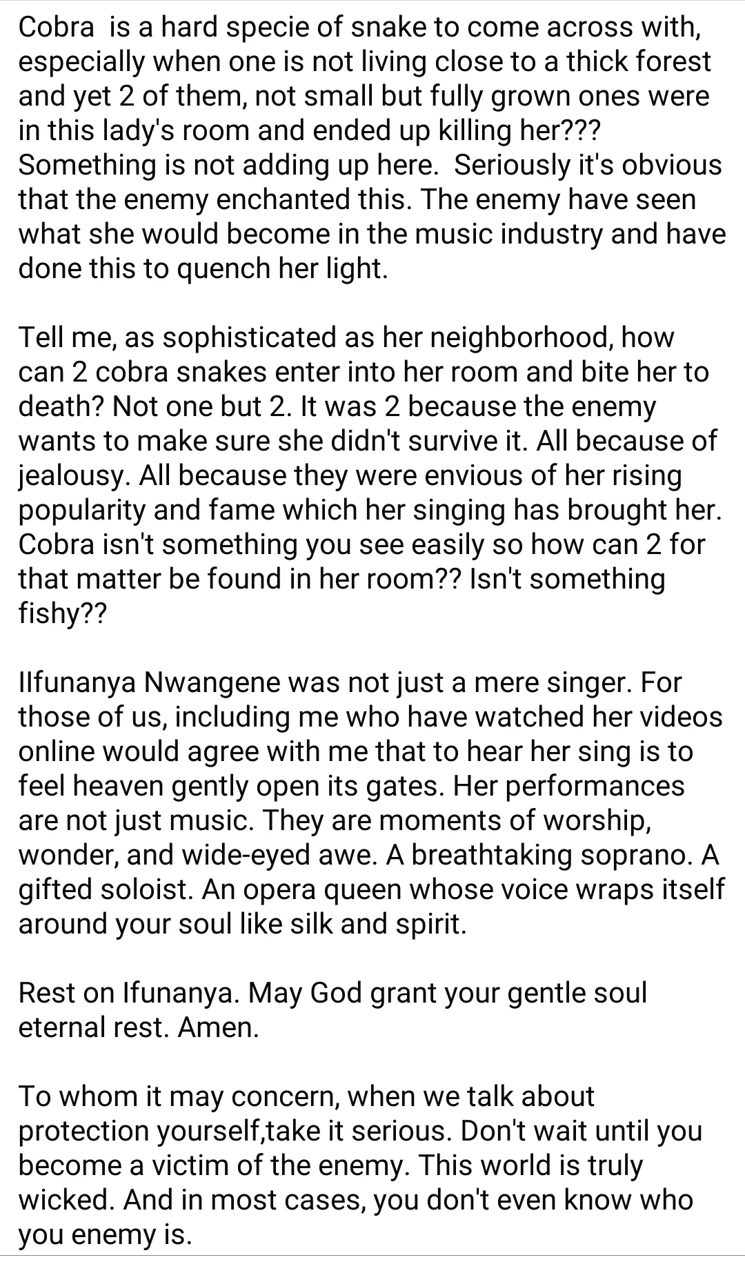 Cobra is a hard specie of snake to come across with, especially when one is not living close to a thick forest and yet 2 of them, not small but fully grown ones were in this lady’s room and ended up killing her??? Something is not adding up here. Seriously it’s obvious that the enemy enchanted this. The enemy have seen what she would become in the music industry and have done this to quench her light.