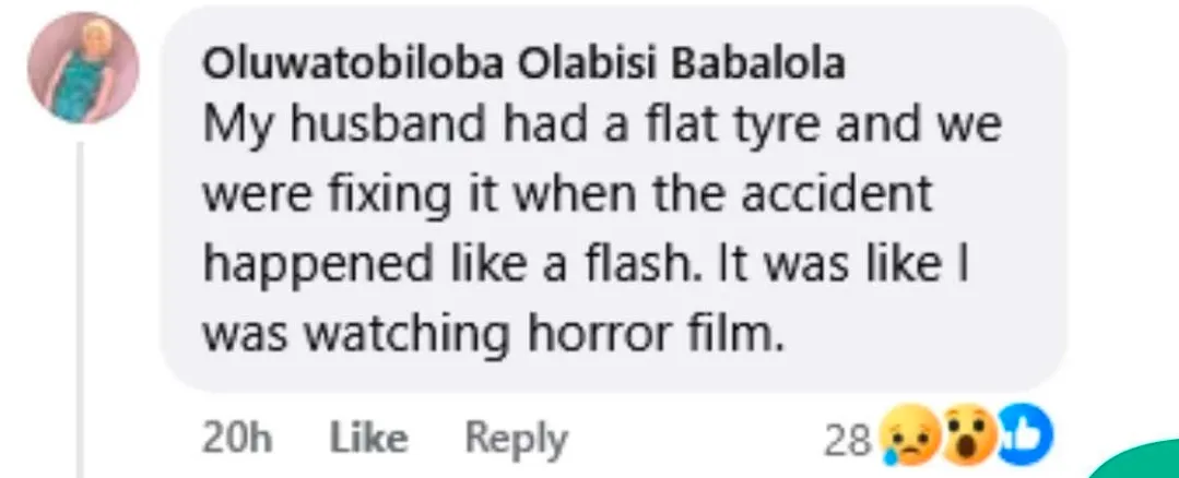 In the comment section of Facebook user Oni Foto’s post, where he shared his experience using the road, Oluwatobiloba said that her husband had a flat tyre on the road, and they were fixing it when Joshua’s accident occurred.