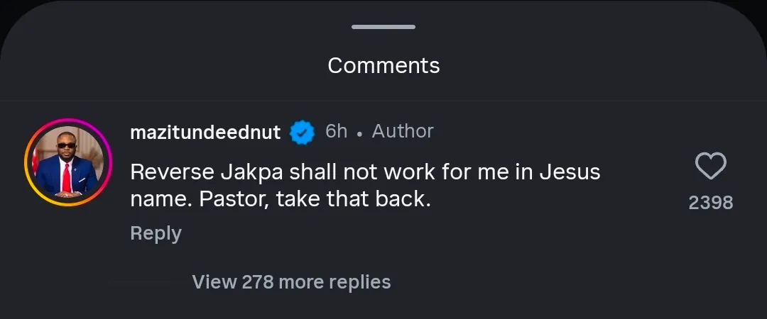 “Reverse Japa shall not work for me in Jesus’ name. Pastor, take that back,” Tunde Ednut wrote.