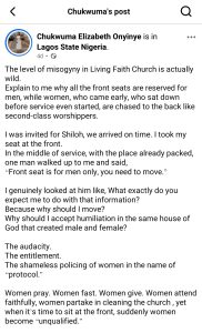 In a Facebook post, Onyinye narrated that in the middle of a service, a man ordered her to leave the front seat where she sat, saying they were only reserved for men.