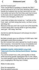 She also frowned at the double standard in the church’s policy on the matter, which allowed the wife of Oyedepo to sit at the front.