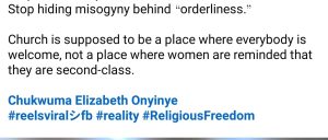 Onyinye claimed that there is a high level of misogyny in the church and wondered why women were treated like second-class worshippers by not being permitted to sit in front, despite arriving early because they are only reserved for men.