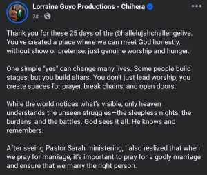 Reacting to her sermon, Lorraine took to her Facebook page to share what she realised after the preaching and her opinion on the Hallelujah Challenge.