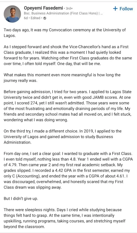 A Nigerian lady identified as Opeyemi Fasedemi, has left many astonished, as she signed out of the University of Lagos, from the department of Business Administration with a first-class after hitting a 4.7 CGPA.