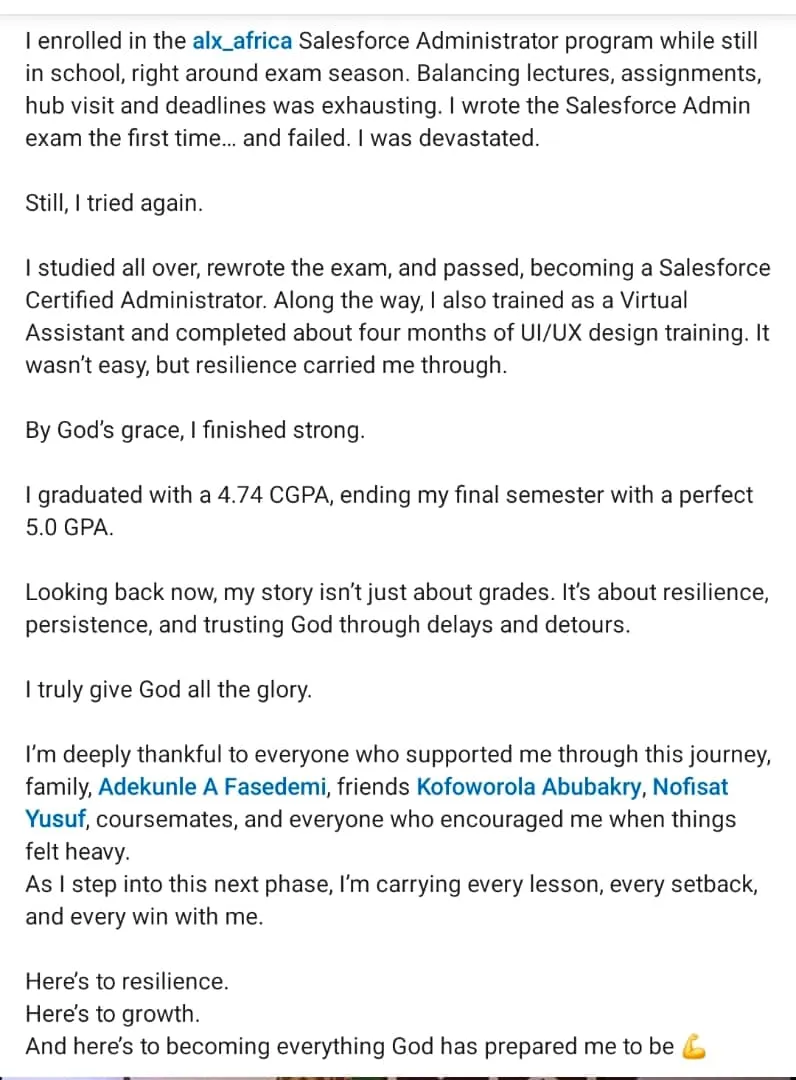 I enrolled in the alx_africa Salesforce Administrator program while still in school, right around exam season. Balancing lectures, assignments, hub visit and deadlines was exhausting. I wrote the Salesforce Admin exam the first time… and failed. I was devastated.