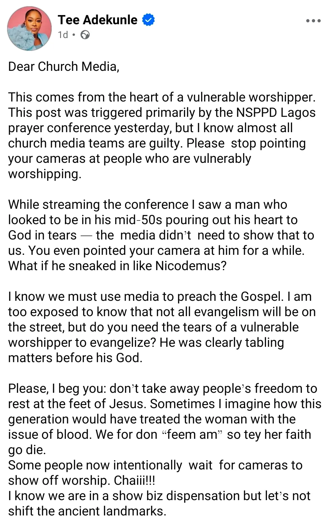 “Dear Church Media, “This comes from the heart of a vulnerable worshipper. This post was triggered primarily by the NSPPD Lagos prayer conference yesterday, but I know almost all church media teams are guilty. Please stop pointing your cameras at people who are vulnerably worshipping.
