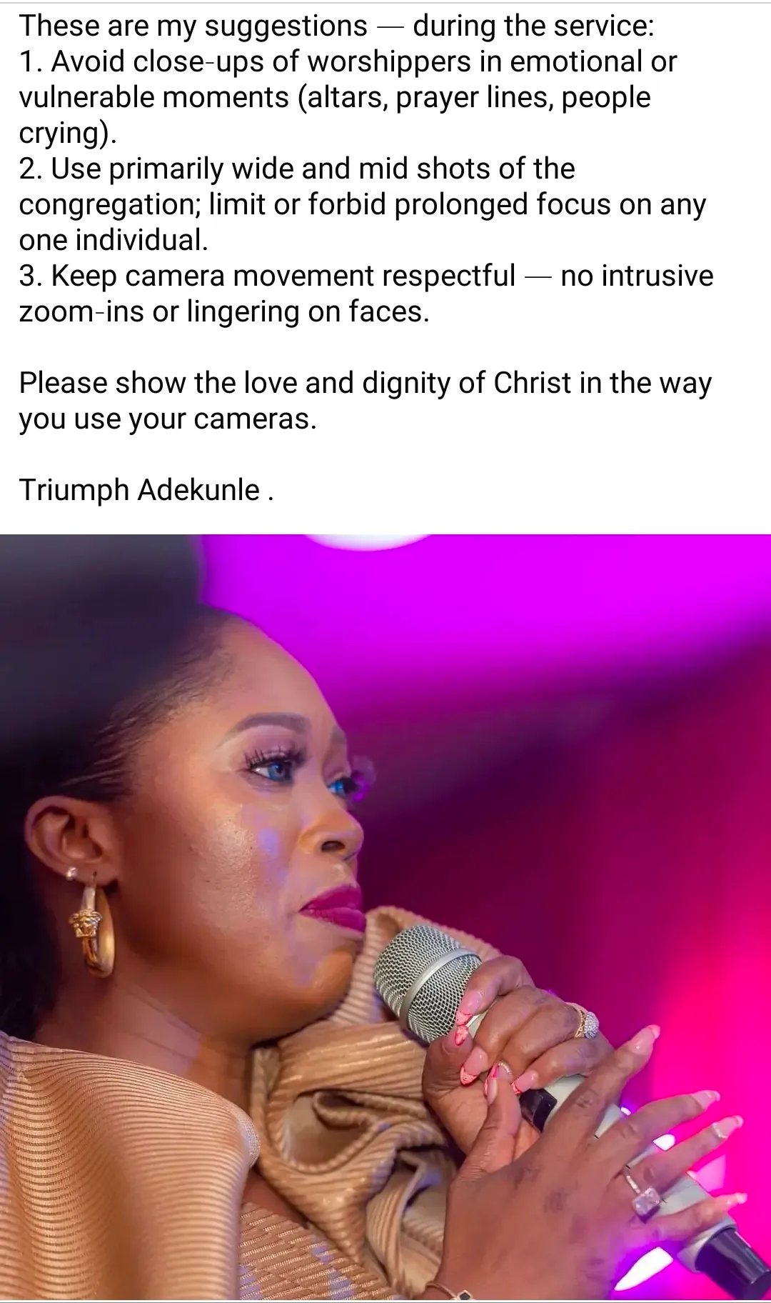 She further advised that church media teams should limit prolonged focus on any one individual and stop intrusive zoom-ins or lingering on worshippers’ faces.