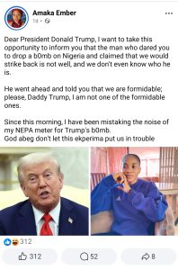 “Dear President Donald Trump, I want to take this opportunity to inform you that the man who dared you to drop a bomb on Nigeria and claimed that we would strike back is not well, and we don’t even know who he is.
