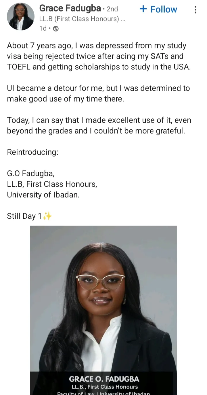 Celebrating her academic feat on X, an excited Grace said that about seven years ago, she was depressed after her US study visa applications were rejected twice.