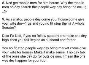 “9. As senator, people dey come your house come give your wife [drugs] and you no fit stop them? A whole Senator? “Dear Pa Ned, if you no follow support am make she dey high, then you fail Regina as husband and father. You no fit stop people wey dey bring market come give your wife for house? Make it make sense. I no dey talk of the ones she dey do for outside ooo. I mean the one wey dey happen for your roof.”
