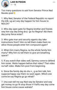 “1. Why Ned, Senator of the Federal Republic, no report the [drug] act wey dey happen for him house to NDLEA?